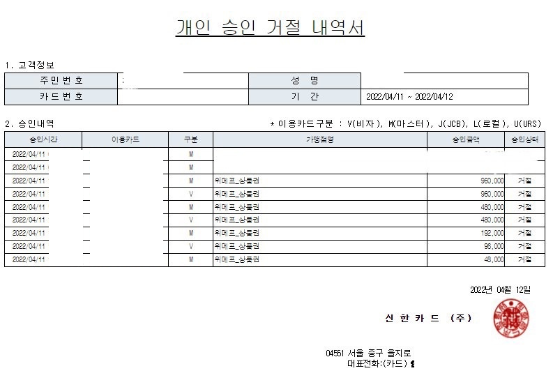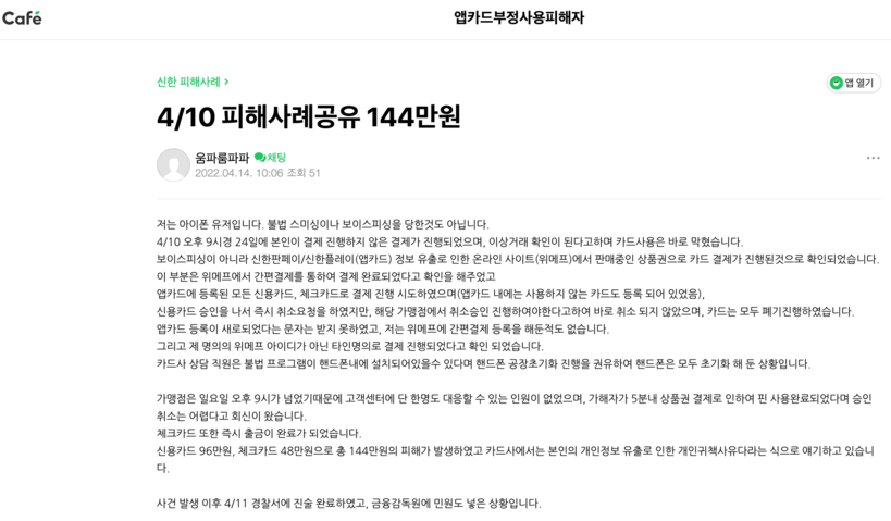 -피해자 B씨 "신한카드 콜센터에 문의, 카드사 측에서 해줄 수 있는 것 없다며 수사기관으로 의뢰 답변" 분통