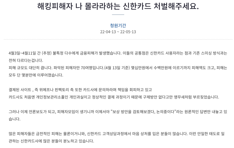 이날 청와대 청원게시판에도 ‘해킹피해자 나 몰라라하는 신한카드 처벌해주세요’라는 제목의 청원글이 게시됐다.