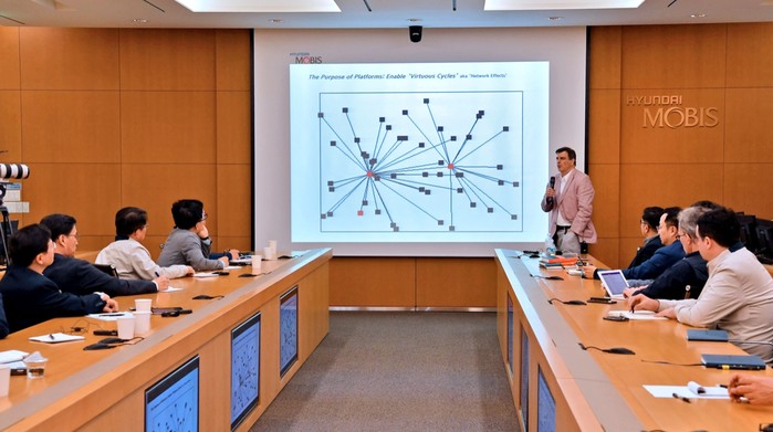 현대모비스에 따르면 지난 6일 MIT 경영대학 교수이자 미국 연방정부 혁신 자문인 마이클 슈라지(Prof. Michael Schrage) 교수가 박정국 사장을 비롯한 50여 명의 회사 경영진을 상대로 ‘차세대 IT’ 를 주제로 강연을 펼쳤다.
