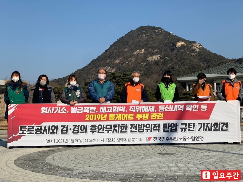 ▲민주일반연맹 등 노동계와 고속도로 톨게이트 노동자들은 지난 20일 청와대 앞에서 도로공사의 보복성 탄압과 징계를 규탄하는 기자회견을 열었다.(사진 = 김상영 기자)