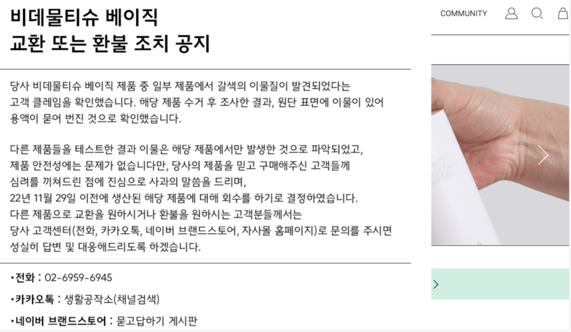 이에 대해 생활공작소는 자사 홈페이지에 비데물티슈 베이직 교환 또는 환불 조치를 공지했다.