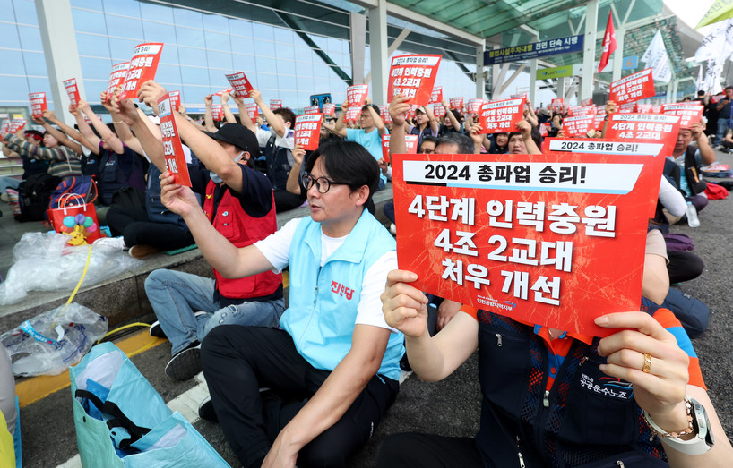 ▲ 민주노총 전국공공운수노조 인천공항지역본부 조합원들이 지난해 7월 30일 오전 인천국제공항 2터미널에서 '인천공항지역지부 2024년 총파업 출정식'열고 '4단계 인력충원 및 4조 2교대 처우 개선' 등을 촉구하고 있는 모습. (사진=newsis)