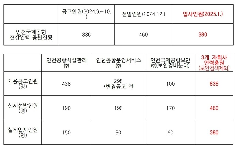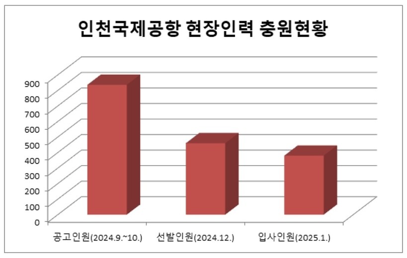 민주노총 공공운수노조 인천공항지역지부(지부장 정안석, 이하 노조)의 조사에 따르면 4단계 확장 이후 신규 채용된 현장 인력은 380명에 불과해 인천공항의 현장 인력은 심각한 부족 상태다. 이는 지난해 9~10월 인천공항의 3개 자회사가 채용 공고를 낸 836명의 절반에도 못 미치는 수준이다.