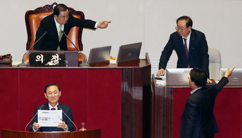 ▲ 필리버스터 중 국회의장에게 항의중인 권성동 의원 (사진=뉴시스) |