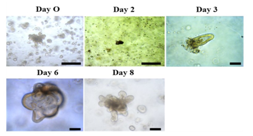 | ▲ 배양기간에 따른 3차원 세포 집합체 형태의 한우 소장 오가노이드. (사진=농촌진흥청) |