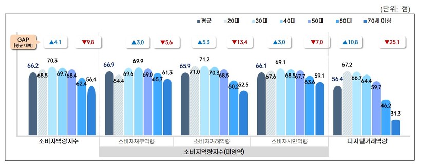 대영역별로는 ‘소비자 재무역량’ 8.6점, ‘소비자거래역량’ 18.7점, ‘소비자 시민역량’ 10.0점이었다. 특히 ‘디지털 거래역량’의 연령별 격차는 35.9점(20대 67.2점·70세 이상 31.3점)으로 소비자역량 전 부문에 걸쳐 가장 커 격차 해소를 위한 방안 마련이 필요한 것으로 나타났다.