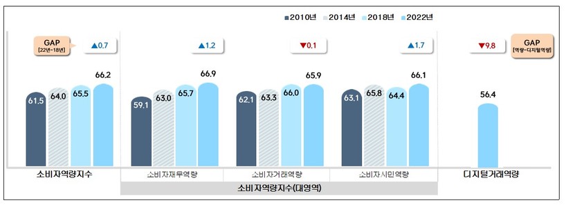 올해 소비자역량지수는 66.2점으로 2018년 제3차 조사보다 0.7점 상승했다. 올해 처음으로 측정된 디지털 거래역량은 56.4점이었다.