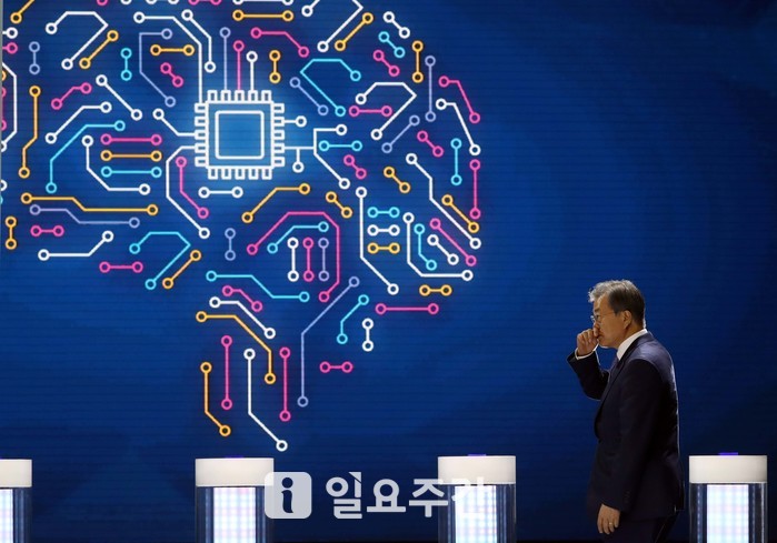 | ▲삼성전자는 지난 4월 30일 화성캠퍼스 부품연구동(DSR)에서 세계최초 EUV공정 7나노로 출하된 웨이퍼·칩을 공개했다. 사진은 시스템 반도체 비전 선포식에 참석한 문재인 대통령이 세리모니를 하기 위해 단상에 오르고 있는 모습. |
