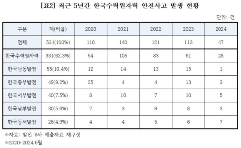 가장 많은 사상자가 발생한 한수원의 경우 안전사고에 대한 특단의 대책이 필요하다는 지적이 제기되고 있다. 올해도 안전사고가 28건 발생하며 전체 안전사고(47건)의 절반 이상을 차지했다.