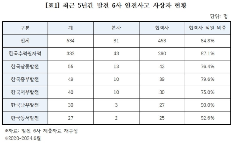 [일요주간=임태경 기자] 지난 23일 국회 산업통상자원중소벤처기업위원회 소속 더불어민주당 송재봉 의원에 따르면 2020년부터 올해까지 최근 5년 간 한국전력 산하 6개 발전 공기업(한국수력원자력, 한국남동발전, 한국중부발전, 한국서부발전, 한국남부발전, 한국동서발전)에서 안전사고로 인한 사상자가 534명에 달하는 것으로 나타났다. 발전사별 사상자는 한국수력원자력(이하 한수원)이 안전사고 사상자가 333명으로 가장 많았고 그 중 협력사 직원 비중은 87.1%(290명)에 달했다.