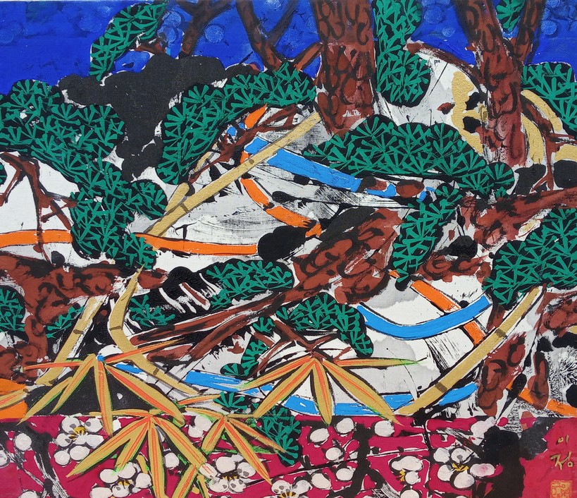 ▲ ‘사유원형-新 세한삼우’ 엄동설한에 꿋꿋하게 푸르름과 향기를 피어내는 ‘매화, 대나무, 소나무’의 삼우(三友)를 통해 지조와 절개, 의연한 모습을 표출. 현대적 구성으로 색채를 대담하게 혼용.