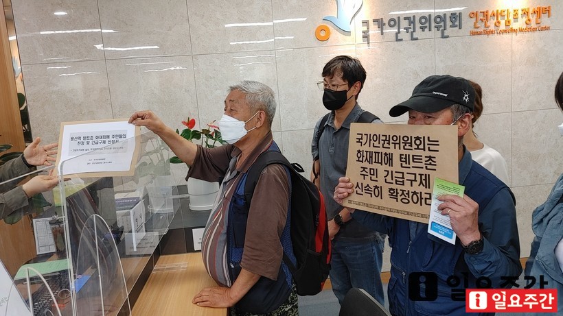 ▲지난 27일 화재 사고 피해자이자 텐트촌 주민 등이 용산구청 규탄 기자회견 직후, 국가인권위원회 측에 진정 및 긴급구제 신청서를 제출하고 있다. <사진=성지온 기자>