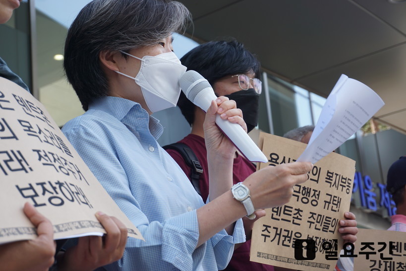 그는 “용산구청은 현재 ‘주소지 등록이 되어 있지 않다’, ‘3개월 실거주 이력 확인이 안 된다.’ 등의 이유로 텐트촌 주민들이 ‘주거 취약계층 주거지원’사업 대상이 아니라고 주장하고 있다”라면서 “하지만 이는 근거 없는 자의적 판단이다. 주소지 등록 여부는 입주 대상자 선정 기준과 무관하다. 3개월 이상 비주택 거주사실을 확인할 수만 있다면 신청에 아무런 문제가 없다”라고 강조했다.