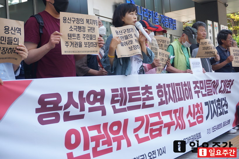 그러면서 “피해자들은 용산구청의 주거지원 거부 및 지연으로 인하여 인간으로서의 존엄과 가치(헌법 제10조), 생명·신체의 안전(헌법 제10조, 12조), 거주의 자유(헌법 제14조), 주거의 자유(헌법 제16조), 인간다운 생활을 할 권리(헌법 제34조), 쾌적한 환경에서 생활할 권리 등을 침해받고 있다”라면서 “피해자들이 화재 등 재난, 강제 철거, 부적정·불안정한 주거환경 등의 위협으로부터 인간으로서의 존엄, 생명·신체에 대한 안전, 주거권 등을 보장받을 수 있도록 ‘주거 취약계층 주거지원’ 대상자로 조속히 인정할 것을 권고한다”라고 인권위 긴급구제 신청 취지를 설명했다.
