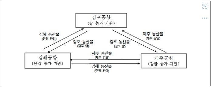 김포공항 인근 농가에서 '김포 쌀'을 구매하고, 김해공항에서는 '진영 단감'을, 제주공항에서는 '제주 감귤'을 구입한 후 3개 공항 간 품목을 상호 교환하는 방식으로 김포공항 인근 지역민에게는 '진영 단감'과 '제주 감귤'을, 김해공항 인근 지역민에게는 '김포 쌀'과 '제주 감귤', 제주공항 인근 지역민에게는 '김포 쌀'과 '진영 단감'이 지원될 수 있도록 했다.
