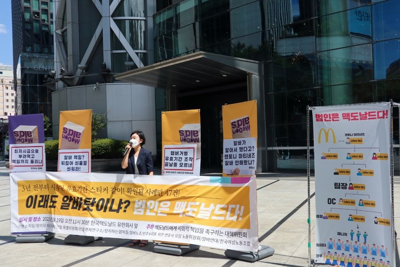 | ▲19일 오전 11시30분 서울 종로구 한국맥도날드 유한회사 앞에서 열린 맥도날드의 유효기간 지난 식자재 사용 규탄 및 알바노동자 중징계 철회 촉구 기자회견.(사진=맥도날드에게 사회적 책임을 촉구하는 대책위원회) |
