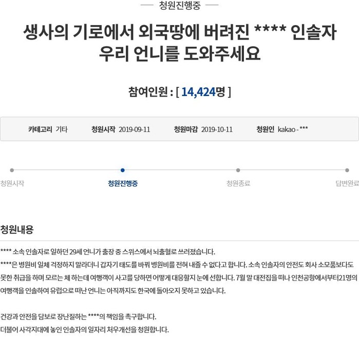 이런 상황에서 A씨의 동생이라고 밝힌 B(청원인)씨는 지난 11일 청와대 청원게시판에 '생사의 기로에서 외국땅에 버려진 인솔자 우리 언니를 도와주세요'라는 제목의 청원글을 통해 노랑풍선과 계약을 맺고 인솔자로 일하던 29세 언니(A씨)가 출장 중 스위스에서 뇌출혈로 쓰러졌다"며 "(노랑풍선은) 병원비 일체 걱정하지 말라더니 갑자기 태도를 바꿔 병원비를 전혀 내줄 수 없다고 한다"면서 말을 바꾼 여행사의 태도를 문제 삼았다.