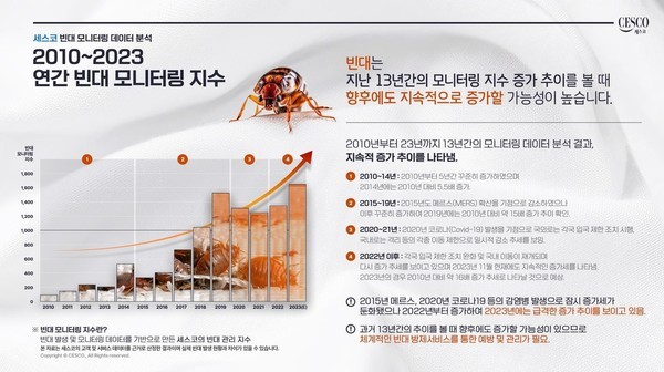 2010년 이후 미국을 비롯한 해외 국가에서 빈대의 수가 급격히 증가하면서 세스코는 국내 사례와 데이터를 축적하고 관리해왔다. 이번에 발표된 '빈대 모니터링 지수'는 지난 13년 동안 축적된 고객 및 서비스 데이터를 기반으로 한 계산 결과라는 게 세스코의 설명이다.
