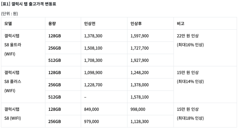소비자주권시민회의는 “만약 이런 이유라면 가격 인상을 당장 그만둬야 한다”며 “경쟁사인 애플은 최근 출시한 아이패드 프로를 전작 대비 최대 60만 원 인상했지만 이후 눈에 띄게 매출이 줄어들었다는 점을 삼성은 명심해야 한다”고 전했다.