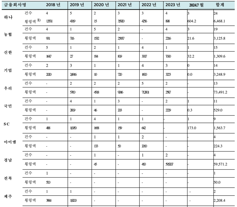 ▲2018년~2024년 7월 31일까지 국내 은행별 임직원 횡령 사건 내역(단위 : 명 , 백만원). (자료=유동수 의원실 제공) |