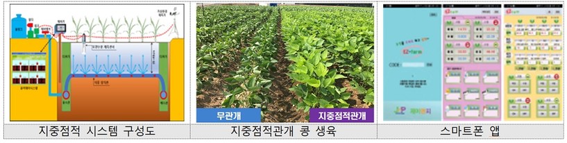 농진청은 “지중점적 자동관개제어시스템은 땅속에 관을 묻고 작물이 필요로 하는 양만큼 물을 공급하는 방식으로 스마트폰으로 실시간 토양 속 수분 관리를 할 수 있다”며 “이 시스템을 적용하면 콩 수량은 26% 늘고 농업용수는 22% 절약하는 효과가 있다”고 설명했다.