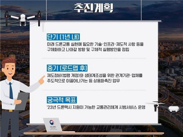 미래드론교통담당관은 정부차원의 드론교통관리체계 마련 및 시범서비스를 2023년에 구현해 민간차원의 드론택시 서비스모델 조기상용화를 유도하겠다는 목표를 밝혔다.