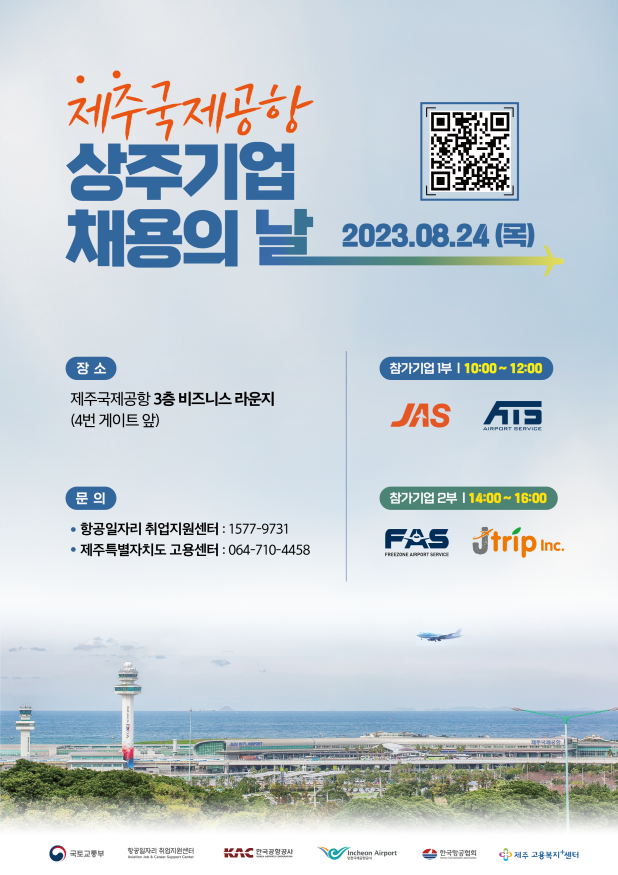 [일요주간=김영란 기자] 한국공항공사(사장 윤형중)는 8월 24일 제주국제공항 3층 비즈니스 라운지에서 '제주공항 상주기업 채용의 날' 행사를 개최한다.