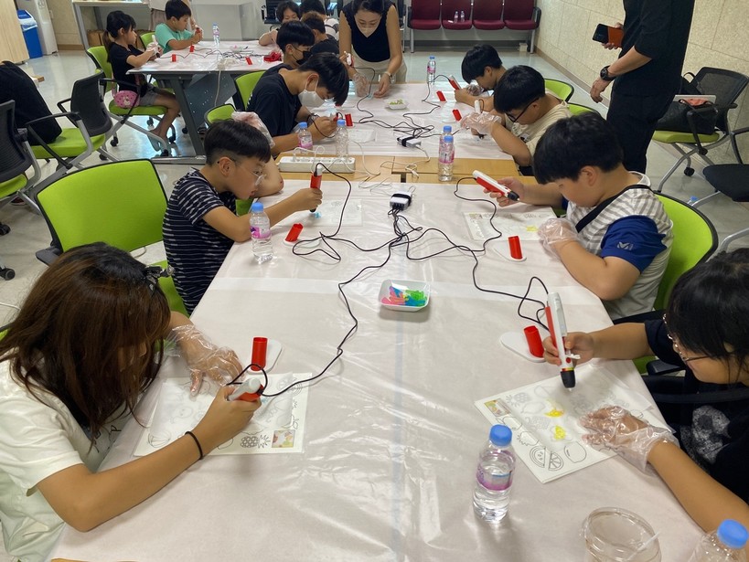 ▲ 8.8(화) 한국도로공사 본사에서 아동들이 3D캔디펜을 이용해 체험 프로그램에 참여하고 있다.(사진=도로공사) |