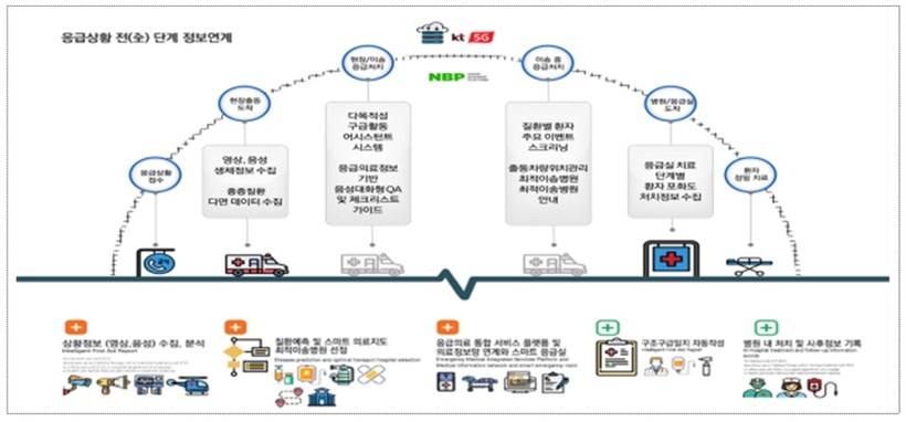 5G 기반 AI 응급의료시스템은 중증응급환자의 병원 이송과 응급처치를 보조하는 지능형 응급의료시스템이다. 서울 서북 3구(서대문마포·은평)와 경기 고양시에서 36대 119 구급차와 9개 응급의료기관에 구축하고 시범 운영된다. 2019년부터 2021년까지 총 228억원(정부 180억원·민간 48억원)이 투입됐다.