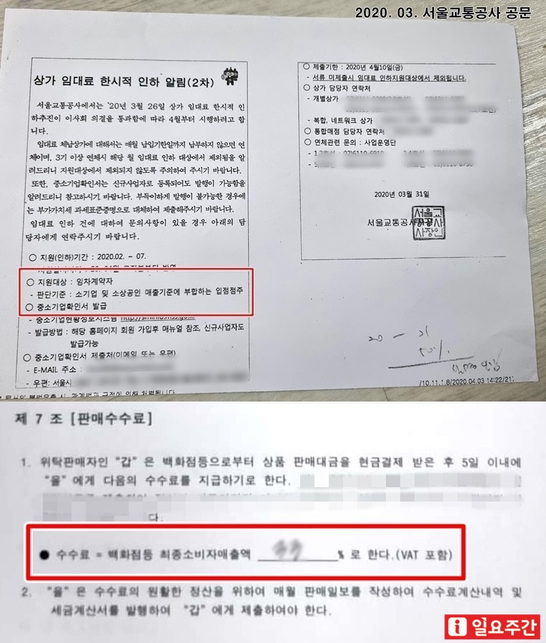 | ▲ (위)서울교통공사가 2020. 03. 31.자로 지하철 상가 임차인을 대상으로 보낸 공문. 지원 대상은 임차계약자인 동시에 소상공인 매출기준에 부합해야 한다고 명시하고 있다. (아래) 점주가 네이처리퍼블릭과 맺은 계약서 중 일부. 판매 수수료 부분만 언급하고 있다. 임대료 납부 점포의 경우 계약서 상 판매 수수료 지급 시 일정 금액의 임대료를 제외하겠다고 명시되어 있다. <사진=제보자 제공> |