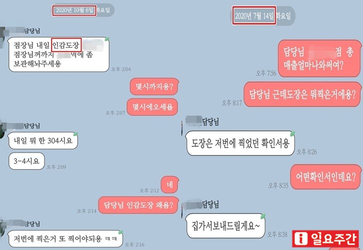 | ▲ A, B 점포의 점주와 네이처리퍼블릭 본사 매장 담당 직원과 주고 받은 메시지. 점주에 따르면 해당 직원은 인감 도장의 사용처를 명확하게 얘기하지 않았고 2020년 몇 차례 가져갔었다고 주장했다. <사진=제보자 제공> |