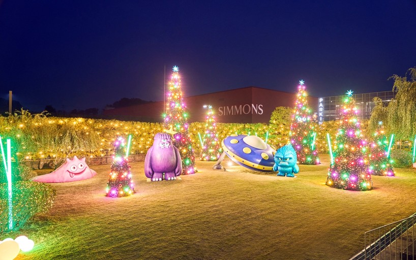 행사장 입구부터 방문객의 시선을 사로잡는다. 주차타워에서 시몬스 테라스로 이어지는 길목에는 대형 레드 크리스마스 트리가 설치돼 본격적인 파티의 시작을 알린다. 테라스 잔디 정원에는 최대 높이 8미터의 메인 트리를 포함한 6개의 트리가 조명을 밝혀 공간을 장식하며, UFO 조형물과 몬스터 캐릭터 조형물 포토존이 초현실적인 분위기를 연출한다. 중정에는 눈꽃 조명 아래 헤드셋을 쓴 피지의 대형 조형물을 중심으로 다이내믹한 파티 공간이 마련되며, 퍼플·핑크 컬러의 버보와 포포 조형물이 환상적인 파티 무드를 완성한다.