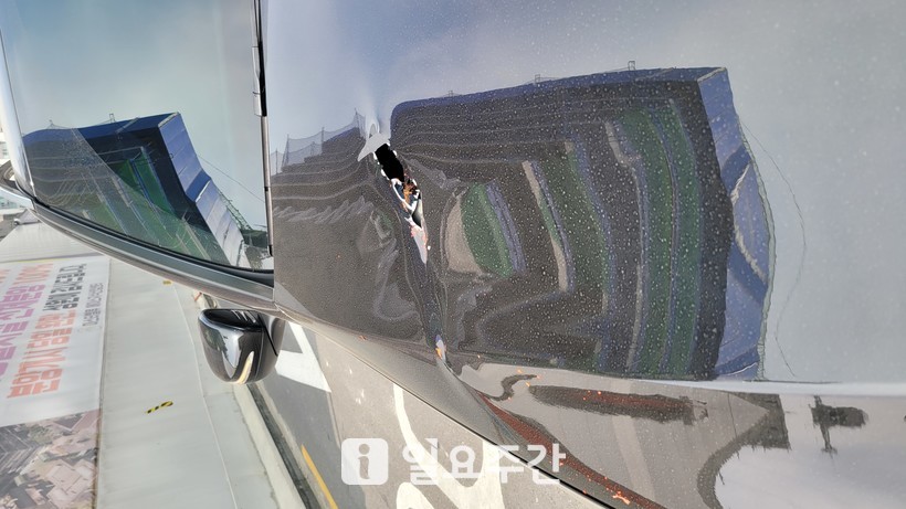 ▲에이스건설 공사현장에서 낙하한 쇠파이프가 차량을 덮쳐 보닛이 파손됐다.(사진=제보자 제공) |