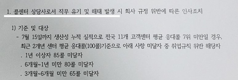 또한 “7월 들어 노사가 콜 수를 올리기 위해 실적평가제도를 합의 하에 변경했고 한 달간의 시범운영 기간을 가지기로 약속했다. 하지만 제도 변경 4일 만에 협박성 공문을 개시하면서 노사합의를 무너뜨렸다”라면서 “절대 묵과할 수 없다”라고 말했다.