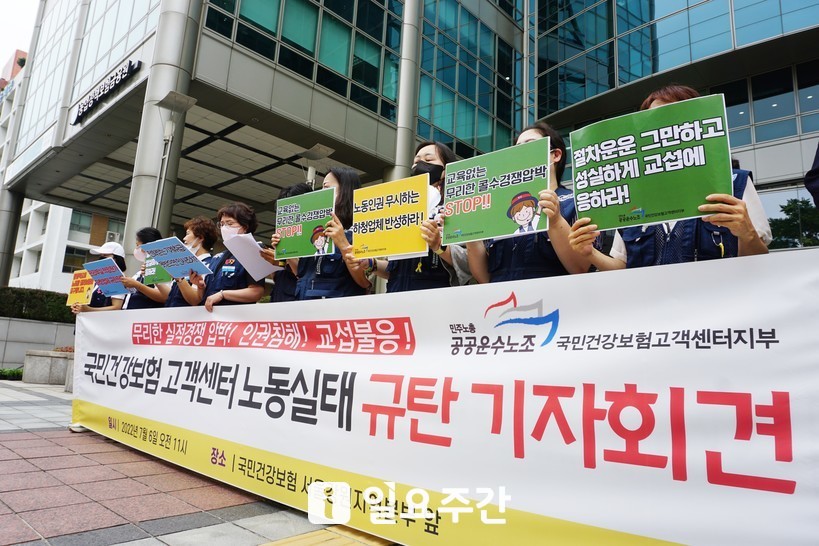 정용재 공공운수노조 부위원장은 “지난 2006년부터 공단과 민간위탁업체는 1600여 명의 상담 노동자들을 콜 수와 인센티브 경쟁으로 내몰고 전화 받는 기계로 취급하면서 착취해 왔다. 이에 따라 국민의 개인정보를 공공이 아니라 민간업체가 관리, 운영하게 됐고 충분한 상담은 뒷전으로 내몰렸다”라면서 “이러한 문제 해결은 복잡하지 않다. 건강보험공단이 협력업체들을 지도하고 의미 없는 콜 수 경쟁도 규제하도록 관리·감독하면 된다”라고 강조했다.
