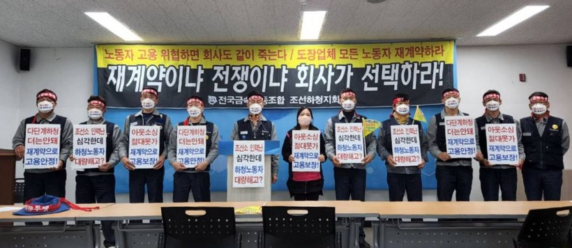 아울러 “하청노동자 임금을 대폭 올리지 않고는 조선업 인력난을 해결할 수 없고, 현재 일하고 있는 하청노동자도 계속 조선소를 떠날 것”이라며 “하청노동조합을 파괴하고 하청노동자를 계속 저임금으로 부려 먹으려는 하청노동자 대량해고와 아웃소싱 확대를 절대 용납할 수 없다”고 강조했다.