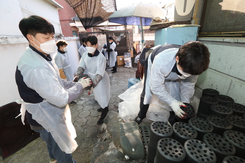 | ▲ 7일 충북 청주시 청원구 우암동 일대에서 진행한 LG생활건강의 연탄 배달 봉사활동에 참가한 노사 임직원들의 모습. (사진=LG생활건강 제공) |