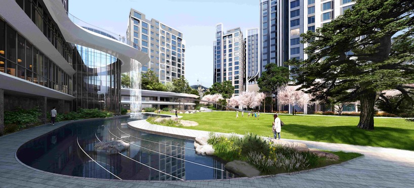 먼저 한강에 인접한 블록은 '물의 정원'을 컨셉으로한 유려한 곡선의 수경 시설을 조성해 마치 한강의 물을 끌어들여 단지로 이어지는 듯한 느낌의 공간으로 설계했다.