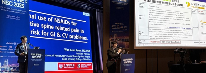 이후 런천 세션에서 발표한 중앙대학교병원 신경외과 고명진 교수는 한국인을 포함한 글로벌 3상 임상에서 안전성과 유효성이 확인된 ‘오보덴스’의 임상적 이점을 소개했다. 고 교수는 “골절 고위험군 환자 치료에 있어 데노수맙은 국내외 치료 가이드라인에서 권고되는 성분으로, 비스포스포네이트(Bisphosphonate) 대비 우수한 효과를 보이며, 10년 이상의 장기 연구를 통해 지속적인 치료 효과와 안전성이 입증됐다”고 설명했다.