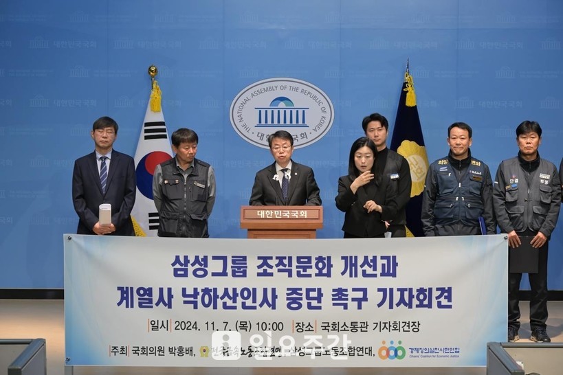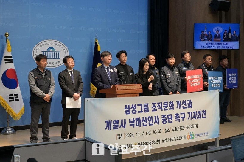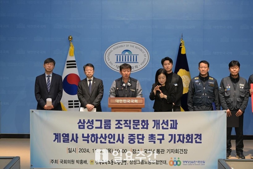 지난 7일 삼성디스플레이 노동조합, 삼성SDI울산 노동조합, 전국삼성전자서비스 노동조합, 삼성생명 노동조합, 삼성생명서비스 노동조합, 삼성화재 노동조합, 삼성화재애니카손해사정 노동조합, 삼성카드고객서비스 노동조합, 삼성웰스토리 노동조합, 삼성에스원참여 노동조합, 삼성E&A &U(엔유)노동조합 등 삼성연대는 국회소통관에서 삼성그룹 조직문화 혁신을 위한 삼성 직원들의 공동요구안 발표 기자회견을 열고 이같이 촉구했다.
