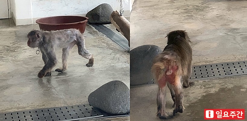 | ▲제주 리조트시설 ‘퍼시픽 리솜’ 내 공연에 동원되는 일본 원숭이에게서 털 빠짐 현상이 관찰된다. 동물자유연대에 따르면 해당 원숭이들은 과도한 스트레스로 인해 정형 행동까지 보였다. <사진=동물자유연대 제공> |