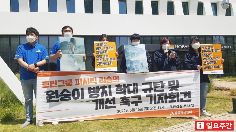 동물자유연대(이하 동자연)는 지난 16일 서울 서초구 호반건설 본사 앞에서 제주 퍼시픽리솜 내 원숭이들의 열악한 사육환경 규탄 및 개선을 촉구하는 기자회견을 열었다. 퍼시픽리솜의 소유주는 호반그룹이다.