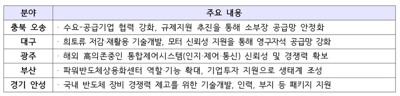 산업부가 오늘(3일) 발표한 특화단지별 맞춤형 지원방안은 지난해 7월 지정된 특화단지에 대한 정부 차원의 지원방안으로 5개 단지 공통으로 ▲수요-공급기업 공동 연구개발(R&D)(200억 원) ▲실증 지원 테스트베드 구축(200억 원) ▲소부장 인력양성(15억 원) ▲금융.기술 지원 등의 내용이 담겨있다.
