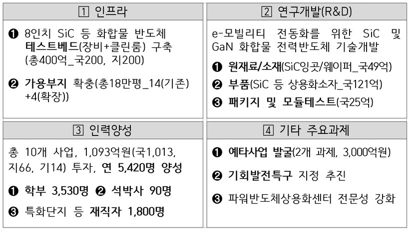 다음으로, 8인치 화합물 전력반도체 생산을 뒷받침하고 국내 화합물 전력반도체 공급망을 구축하기 위해 200억 원 규모의 연구개발(R&D)를 추진한다.