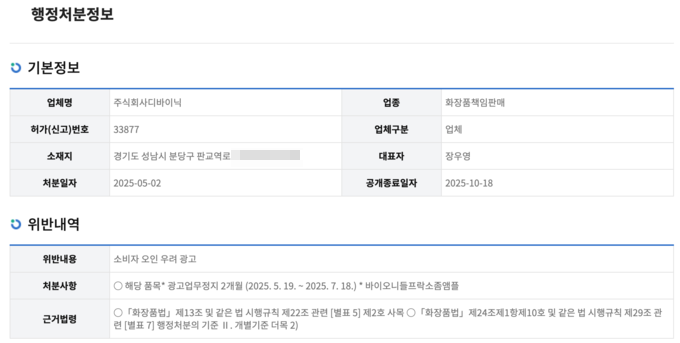 처분 내용에 따르면 디바이닉은 5월 19일부터 7월 18일까지 2개월 동안 해당 품목에 대한 광고를 진행할 수 없게 된다. 이 처분은 화장품법 제13조 및 시행규칙 제22조, 제24조 제1항 제10호와 관련된 규정을 위반한 결과로 내려졌다.