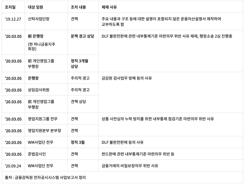 금융감독원 전자공시시스템상 하나은행의 사업보고서에 따르면 2019년 이후 금융감독원에 의해 제재를 받은 임직원 총 11건에 대한 제재 내역을 확인할 수 있다. 공시된 총 11건의 제재 가운데 9건의 제재가 하나은행의 DLF 불완전판매 및 관련 내부통제기준 마련의무 위반, 관련 금융감독원 검사업무 방해 등에 대한 2020년 3월 5일 부과된 조치였다.
