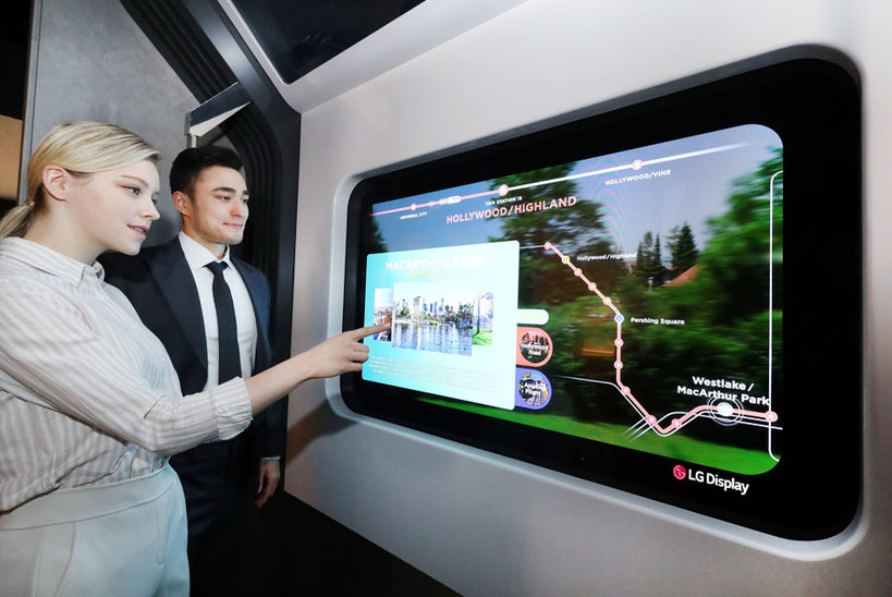 ‘메트로 존’에서는 지하철 객실 유리창을 투명도 높은 투명 OLED로 대체해, 승객들이 유리를 통해 노선도나 지역 정보를 확인할 수 있도록 했다.