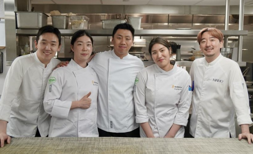 ▲ 2일 美 뉴욕 ‘NARO’ 레스토랑에 모인 박윤수 셰프(NARO), 백경록 셰프(Cuisine. K), 박주은 셰프(주은), 이승현 셰프(Cuisine. K), 박정현 셰프(NARO)(사진 맨 왼쪽부터). |