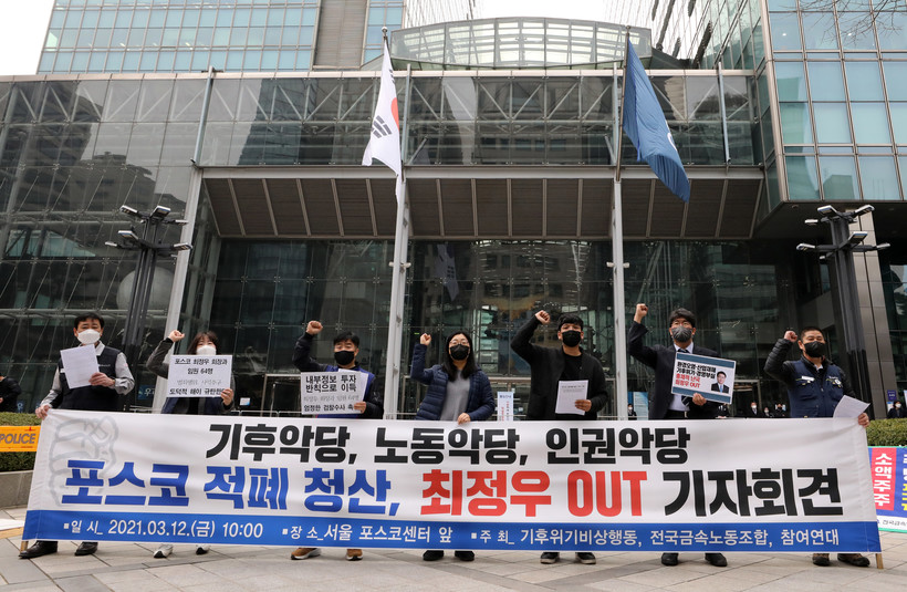 ▲12일 오전 포스코 주주총회가 열린 서울 강남구 포스코센터 앞에서 기후위기비상행동, 전국금속노동조합, 참여연대가 포스코 적폐 청산, 최정우 OUT 등 포스코를 규탄하는 기자회견을 하고 있다.(사진=newsis) |