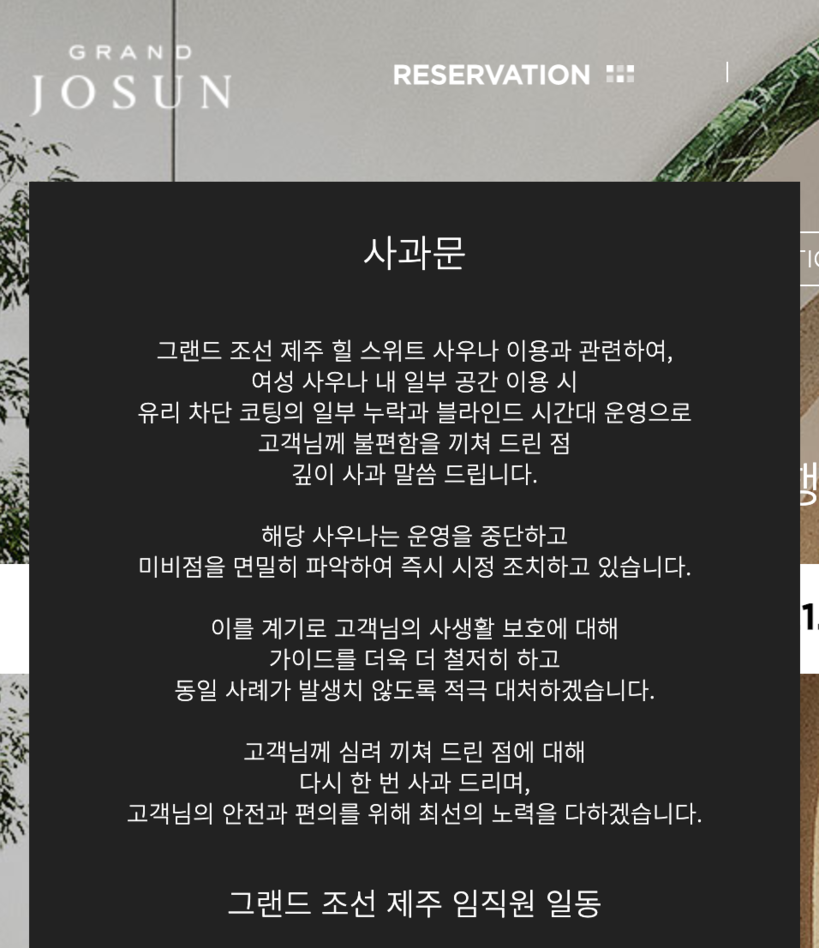 ▲그랜드조선 제주는 여성 사우나 외부 노출과 관련해 홈페이지에 사과문을 게시했다. |